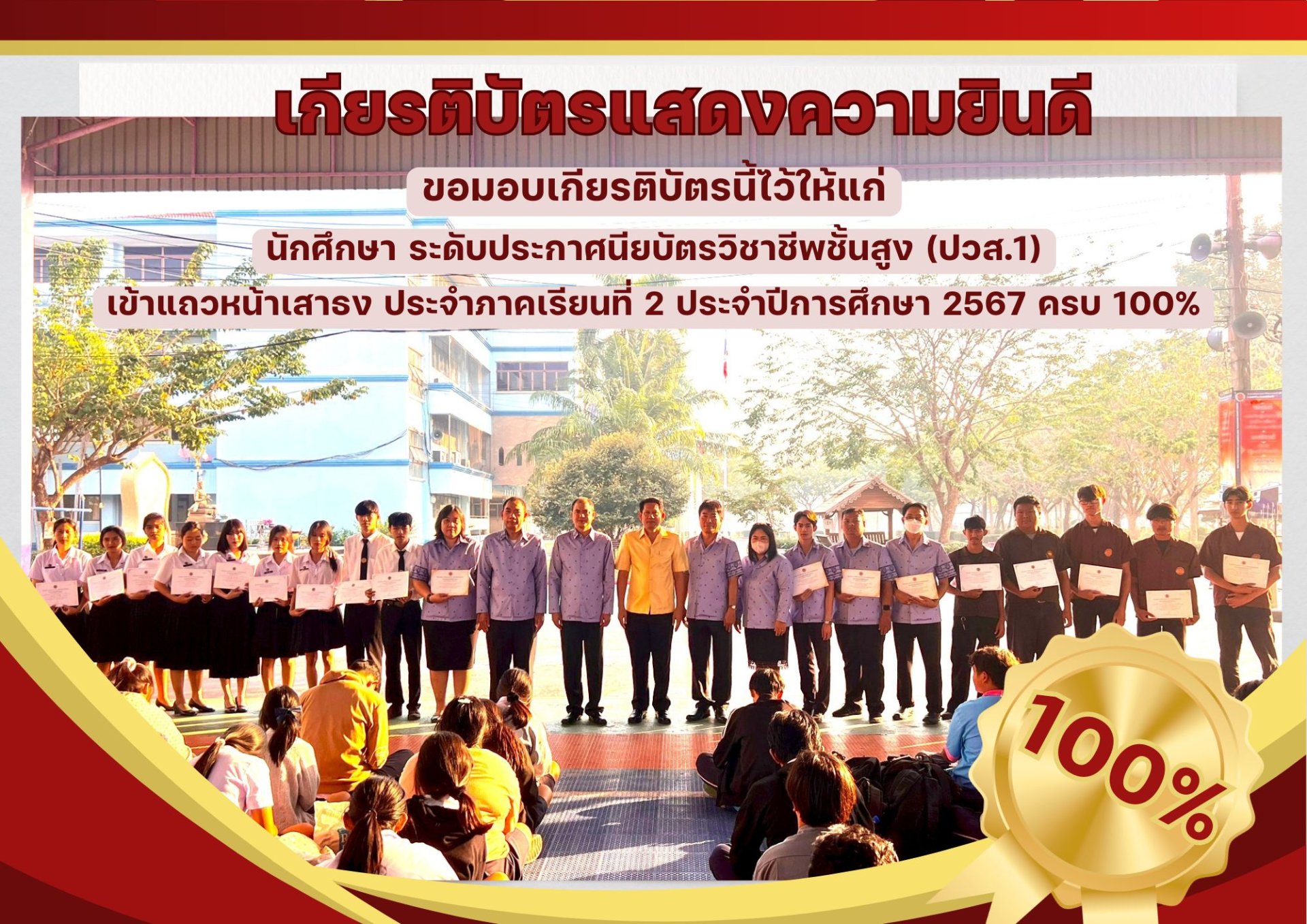 นายจรูญ อินไข ผู้อำนวยการวิทยาลัย คณะผู้บริหาร ร่วมมอบเกียรติบัตรให้แก่นักศึกษาระดับประกาศนียบัตรวิชาชีพชั้นสูง (ปวส.1) ผู้เข้าร่วมกิจกรรมเข้าแถวหน้าเสาธง ครบ 100 % เพื่อเป็นรางวัลการันตีความมีวินัยของนักศึกษา ประจำภาคเรียนที่ 2 ปีการศึกษา 2567 ครบ 100% เมื่อวันที่ 24 มกราคม 2568 ณ อาคารโดมอเนกประสงค์
