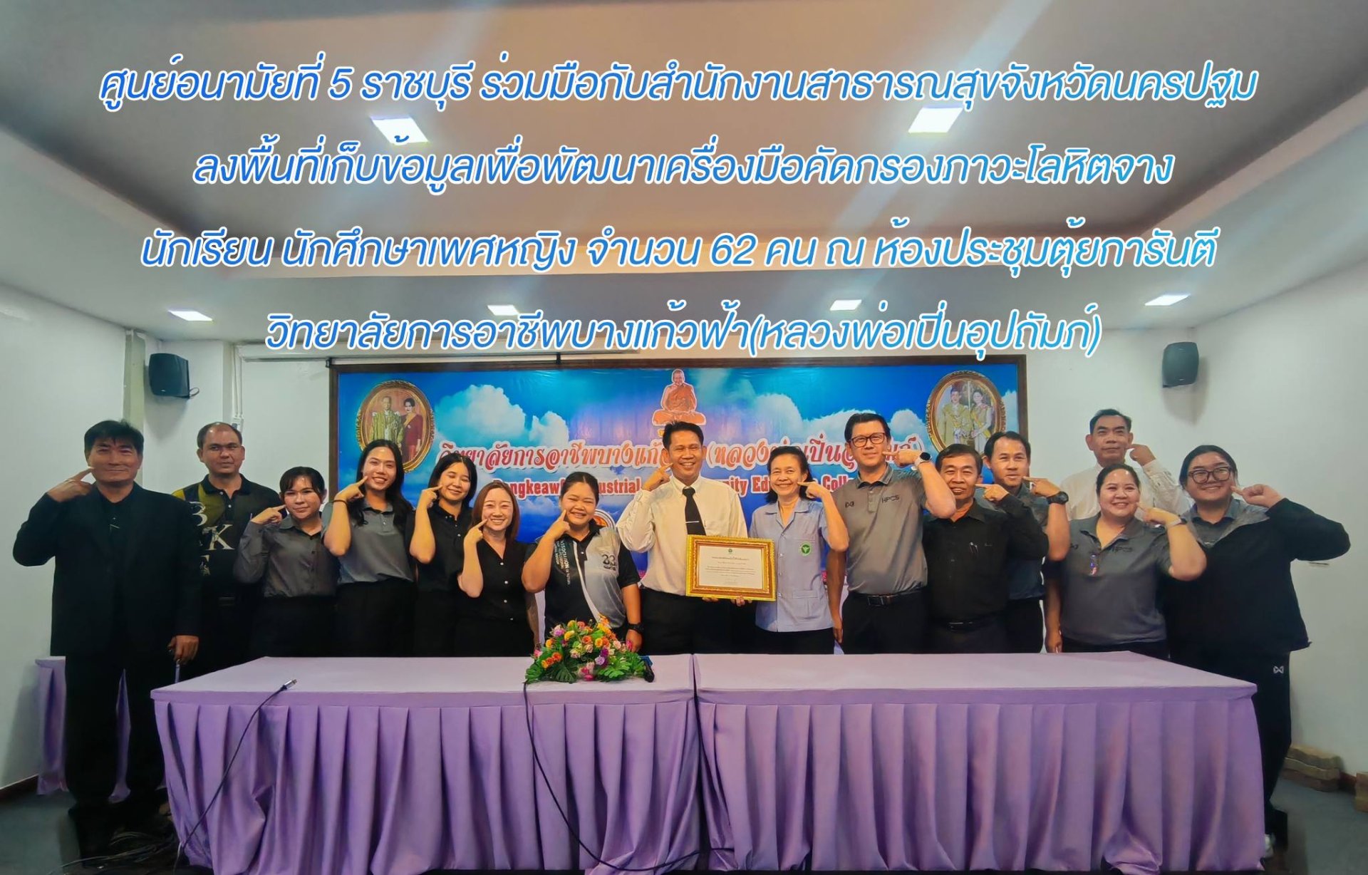 วิทยาลัยการอาชีพบางแก้วฟ้า(หลวงพ่อเปิ่นอุปถัมภ์) นำโดยนายจรูญ อินไข ผู้อำนวตการวิทยาลัย ได้รับเกียรติบัตรเข้าร่วมโครงการวิจัย “การพัฒนาเครื่องมือคัดกรองภาวะโลหิตจางด้วยตนเอง สำหรับหญิงวัยเจริญพันธุ์ในประเทศไทย” (Development of a Self-Screening Tool for Anemia among Women of Reproductive Age in Thailand) โดยศูนย์อนามัยที่ 5 ราชบุรี ร่วมมือกับ สำนักงานสาธารณสุขจังหวัดนครปฐม ลงพื้นที่เก็บข้อมูลเพื่อพัฒนาเครื่องมือคัดกรองภาวะโลหิตจาง นักเรียน นักศึกษาเพศหญิง จำนวน 62 คน ณ ห้องประชุมตุ้ยการันตี วันที่ 19 กุมภาพันธ์ 2569