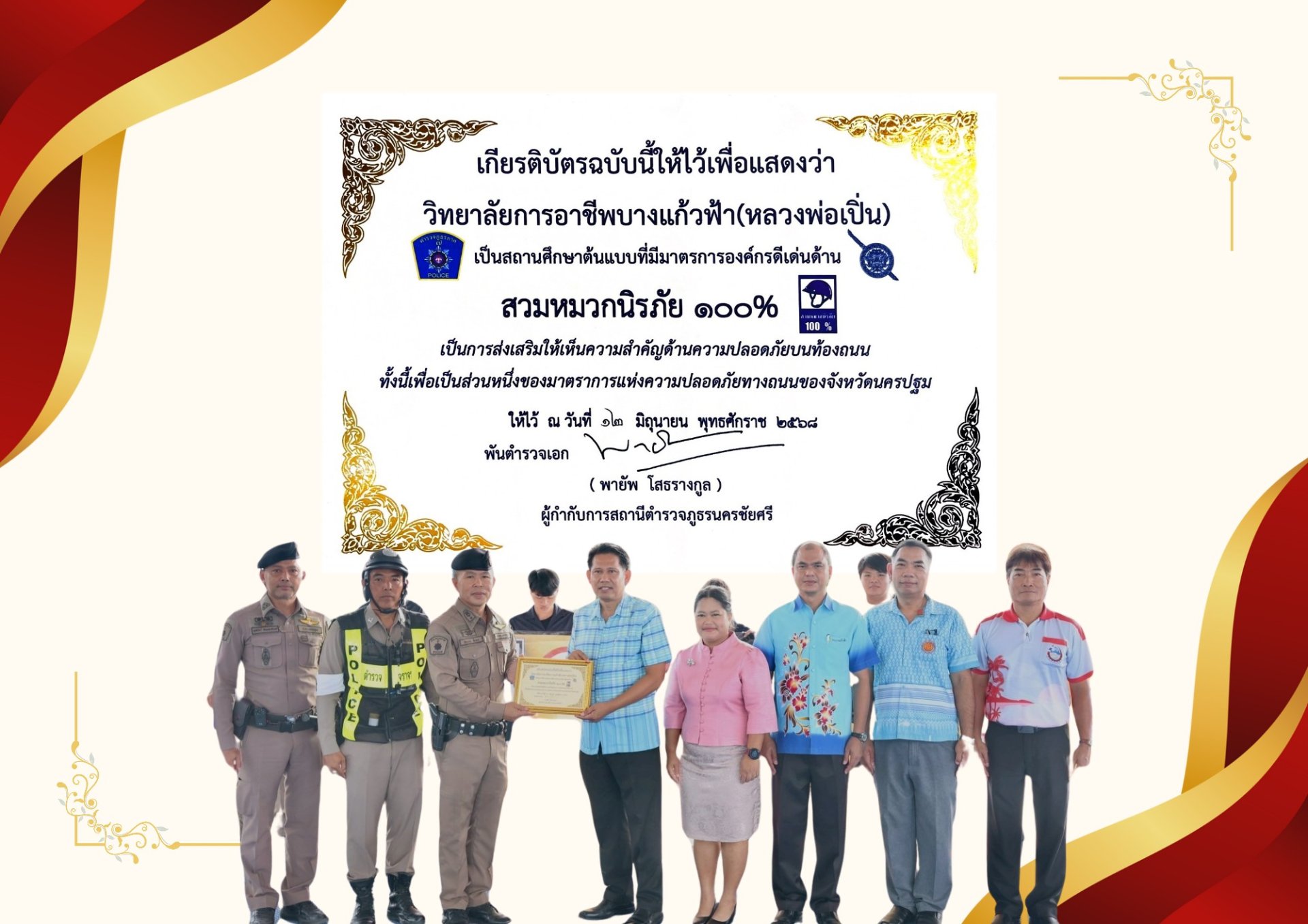 วิทยาลัยการอาชีพบางแก้วฟ้า(หลวงพ่อเปิ่นอุปถัมภ์) นำโดยนายจรูญ อินไข ผู้อำนวยการวิทยาลัย รับเกียรติบัตร สถานศึกษาต้นแบบที่มีมาตรการองค์กรดีเด่นด้าน สวมหมวกนิรภัย 100% โดยผู้กำกับการสถานีตำรวจภูธรนครชัยศรี และให้ความรู้แก่นักเรียน นักศึกษา เกี่ยวกับกฎจราจร ความปลอดภัยบนท้องถนน ณ อาคารโดมเอนกประสงค์ เมื่อวันที่ 13 มิถุนายน 2568